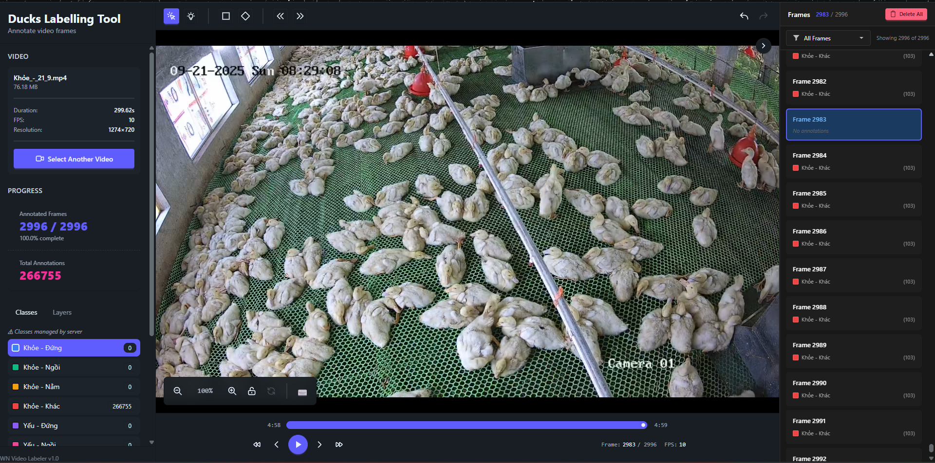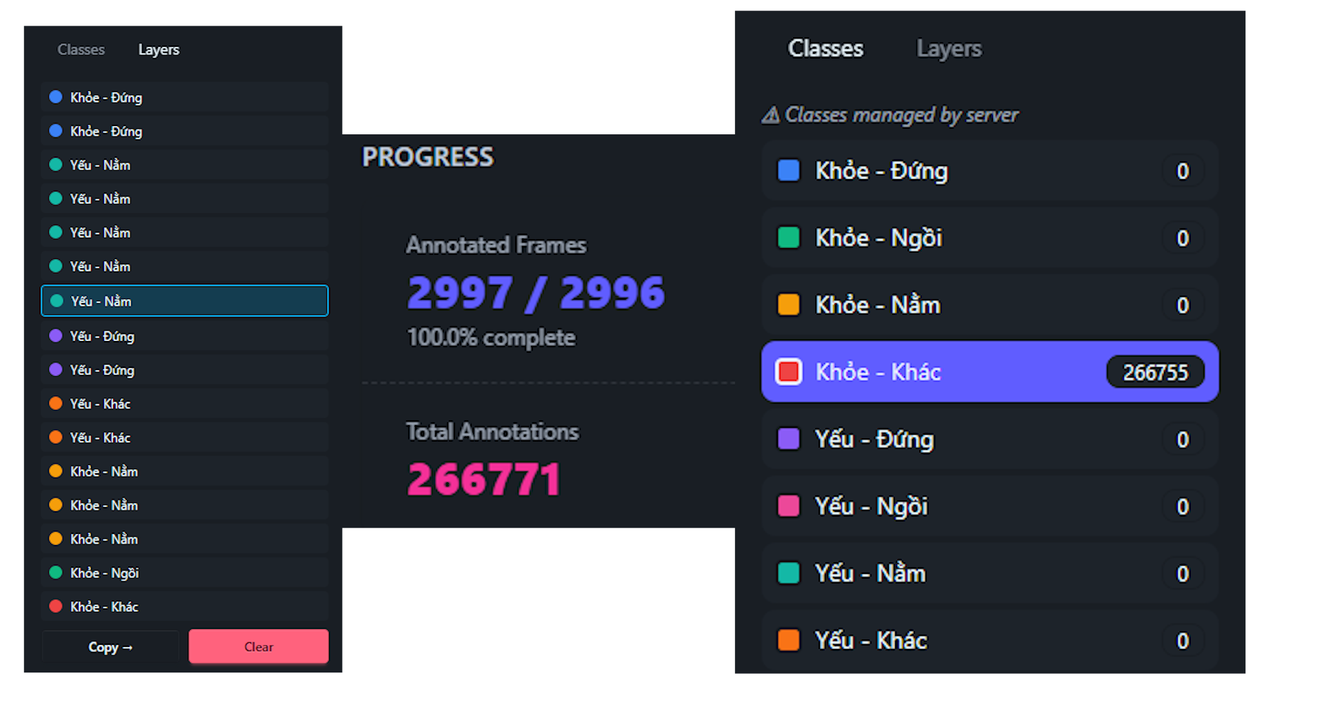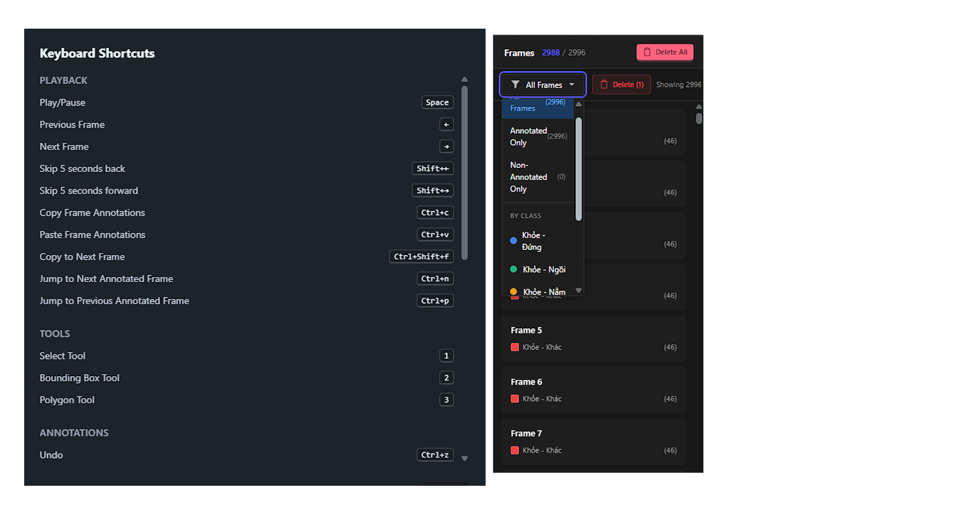 On the right, the Frame Intelligence Panel provides virtual scrolling for massive timelines, filters by annotated/unannotated/specific classes, and multi-frame selection with confirmation dialogs for safe bulk cleanup. Work remains safe through continuous autosave (localStorage snapshots) and debounced server sync; even a refresh or brief disconnect won’t lose progress. Undo/redo captures every operation—including AI imports—so experimentation is reversible. Power users rely on keyboard shortcuts like Space, Ctrl+Z, Ctrl+Shift+F, and ?.