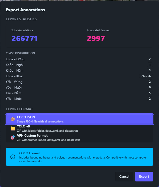 When it’s time to deliver, 1-click exports generate COCO JSON, YOLO v8, or a VPH custom bundle (with frame imagery). A Project Stats summary—total annotations, coverage, class distribution—appears before download. Outputs are timestamped ZIPs created client-side via FileSaver and JSZip, so the UI stays responsive.